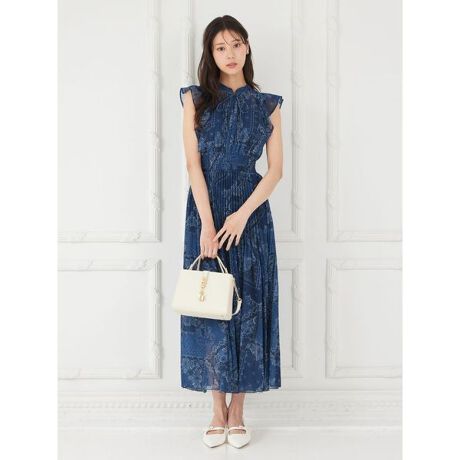 上身頃はタックプリーツを入れ、スタンドカラーで上品な雰囲気に。二の腕をカバーする柔らかなフレアの袖が可憐な印象を与えます。