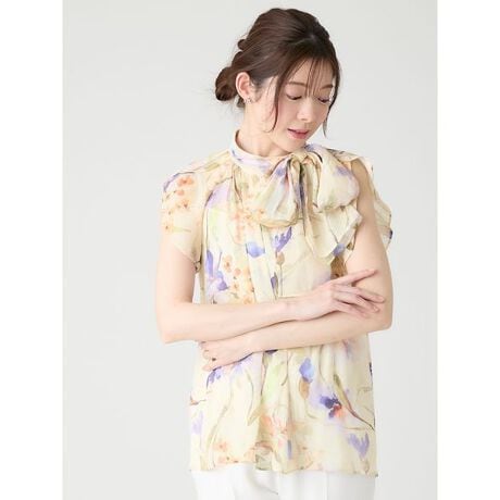 首回りのビッグボウタイはあえてサイドの位置に結べる設定にし、大人上品な印象に。ペタルスリーブデザインで、涼し気ながら肩回りをカバーします。細身のパンツやショートパンツ合わせのコーディネートがおすすめです。
