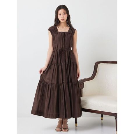 テンセル混の上品な光沢が美しい素材を使用した、ほのかな透け感と上品な光沢が魅力のシアーティアードワンピース。
