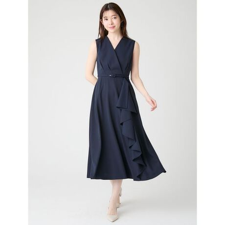 シワになりにくいのも嬉しいポイント。カシュクールデザインと大胆なラッフルが華やかさと女性らしさを両立します。共地のウエストベルト付きでスタイルアップ効果も期待できます。