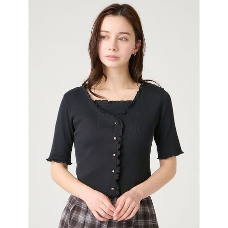 伸縮性のある素材を活かし、メロー始末でフリルを表現しました。ニットのような細リブ見えの素材を使用している為、カットソーでありながら上品さのある見え感に。