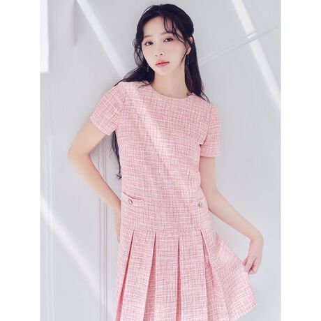 初夏にもぴったりな薄手のツイード生地は、ほのかに煌めくラメ糸が織り込まれており、リュクスな印象を与えます。体型を拾いにくいAラインシルエットで、スタイルアップが叶う切り替え位置にもこだわりました。