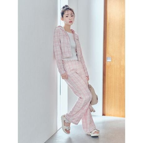 伸縮性のあるツイード風のカット素材を使用したロングパンツ。