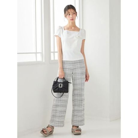 伸縮性のあるツイード風のカット素材を使用したロングパンツ。