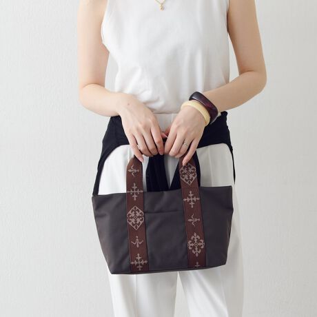 ハンドルにブランド独自のモノグラムテープを配することで、バッグ自体の軽さを維持しながら、日常の装いにアクセントを加えるデザインに仕上げました。