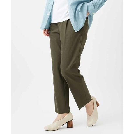コットンリネン糸を使用したストレッチ素材のテーパードパンツ。前は、タック入りですらりと脚をまっすぐ美脚に見せる効果あり。後ウエストは、ゴムを使用した仕様なのでヒップ周りはほどよいゆとりがあるパンツです。きれいめな印象を与えてくれるテーパードパンツですが、天然素材混合のナチュラルな表情がカジュアルアイテムとのコーディネートにもマッチ。汗ばむ時季でも快適で、ストレッチ性にも優れているいるのでデイリーアイテムとして重宝します。また、ご自宅でケアできるのも嬉しいポイントです。