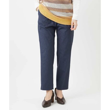 コットンリネン糸を使用したストレッチ素材のテーパードパンツ。前は、タック入りですらりと脚をまっすぐ美脚に見せる効果あり。後ウエストは、ゴムを使用した仕様なのでヒップ周りはほどよいゆとりがあるパンツです。きれいめな印象を与えてくれるテーパードパンツですが、天然素材混合のナチュラルな表情がカジュアルアイテムとのコーディネートにもマッチ。汗ばむ時季でも快適で、ストレッチ性にも優れているいるのでデイリーアイテムとして重宝します。また、ご自宅でケアできるのも嬉しいポイントです。