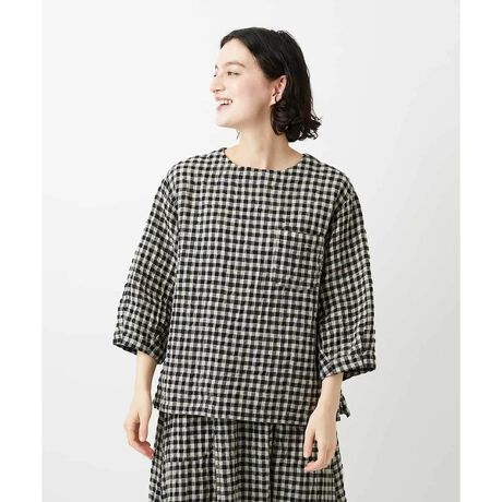 先染めの綿麻混紡糸で丁寧に織り上げた、表情豊かなギンガムチェック素材です。リネン特有のさらりとしたシャリ感と、コットンのやわらかな肌あたりが心地よく重なり合い、ナチュラルで優しい風合いに仕上がりました。さらに製品洗いを施すことで、素材本来の表情を引き立てながら、ふんわりとした柔らかさをプラス。素肌に触れても心地よく、着用した瞬間から体になじんで、こなれた雰囲気をお楽しみいただけます。