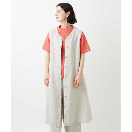 フロントボタン明きのジャンパースカート。洗いの加工により麻でも肌触り良い風合いで、大人なラフ感あるシンプルデザインのAラインシルエット。ポイントはボタン開きのVネック面とクルーネック面と前後どちらを前にしてもスタイリングを楽しめるアイテムです。また、ボタンを数ヶ所止めやフルオープンにした着流しスタイルなどロングジレとしても活用できます。両脇にポケット付き。ナチュラル素材の風合いとビンテージ感ある表情のジャンスカにきれいめボトムを合わせて抜け感あるスタイルなどもおすすめです。同素材のジャケット【NHDGE40430】やパンツ【NHLGE40330】もございます。