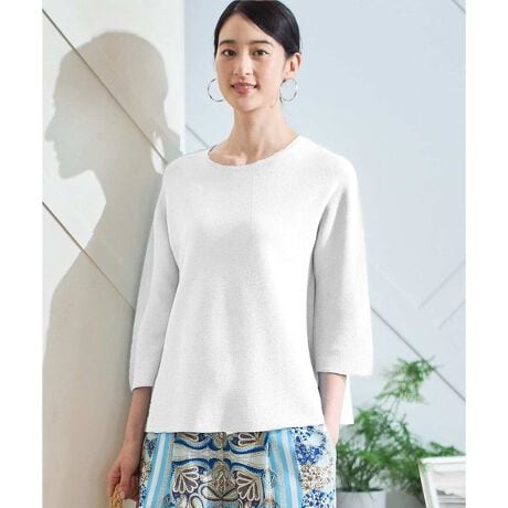 ハイゲージのホールガーメントのお仕立てで、体の締め付け感がない、ストレスフリーの着心地にこだわったニットプルオーバー。