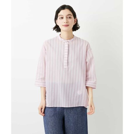清涼感あるストライプローンでややワイド風シルエットに仕上げたプルオーバーブラウス。ボディラインを拾わず暑い時期でも快適な着心地です。スタンドカラーの後ろは ハの字、フロントは Vの字に。前立てはボーダーに。カフスは斜めストライプにと各パーツの柄方向変化もポイント。コットンとポリエステル糸が織りなすローンは、上品なシャツに仕上がっています。一枚着でも季節によってはインナー使いまで幅広いコーディネートに活躍するアイテムです。同素材の前開きブラウス【NHBGF86250】もございます。