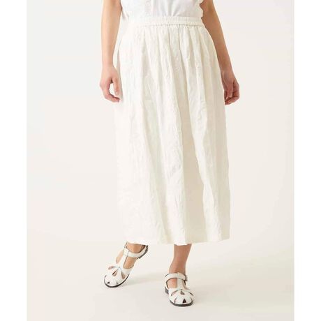 塩縮加工で凹凸感を加えたボタニカルモチーフが表情豊かに浮かび上がるニュアンスあるお作り。コットンローンの清涼感ある風合が春スタイルを盛り上げます。ウエストはゴム仕様でフィット感も良く、トリコット素材の裏地を採用したノンストレスな穿き心地も嬉しい。タックギャザーが程よいボリュームに抑え、広がりすぎない品のあるスタイリングを叶えます。同素材のブラウス【R6BFD25270】と合わせたワンピース風セットアップもおすすめ。※裏地付き
