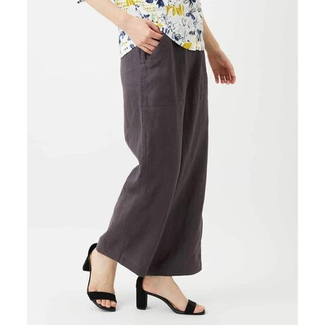 ウエストは総ゴム仕様のはき込みタイプで、快適な着心地に仕立てています。リネン素材ならではのナチュラルな風合いを生かしながら、美しいシルエットで、大人の上品さとリラックス感を兼ね備えたパンツです。前にはパッチポケット、後ろには飾り箱ポケットをあしらい、ヒップラインを自然に美しく見せる視覚効果もあり、清涼感とすっきりとしたシルエットが、暑い日も軽やかに過ごせ、大人の上品さを引き立てる一枚です。