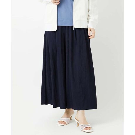 落ち感とナチュラルな表情が特徴のミディ丈のガウチョパンツです。ほんのりととろみのある素材を使用しているので、ボディラインを拾わず、スタイルアップが叶うアイテムです。スカート見えするガウチョパンツ(スカーチョ)はスカートよりも安心感があり、オンオフ問わずに着用できる汎用性の高いアイテムです。オールウエストゴム仕様で楽に穿けつつも、きちんと要素も備わった一着です。