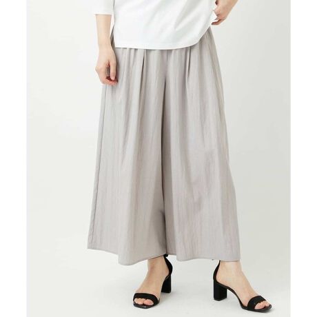 落ち感とナチュラルな表情が特徴のミディ丈のガウチョパンツです。ほんのりととろみのある素材を使用しているので、ボディラインを拾わず、スタイルアップが叶うアイテムです。スカート見えするガウチョパンツ(スカーチョ)はスカートよりも安心感があり、オンオフ問わずに着用できる汎用性の高いアイテムです。オールウエストゴム仕様で楽に穿けつつも、きちんと要素も備わった一着です。