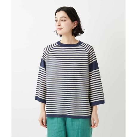 シャリ感のある素材でさらっと着られ、春先から暑い日まで快適に着用できます。ボーダー柄が爽やかで、デイリーコーデにも取り入れやすいアイテムです。ほどよい丈感とフレアデザインで気になるシルエットを自然にカバーし、パンツやスカートにもバランスよく合わせられるトップスです。同素材のカーディガン【NHSGE40270】もございます。