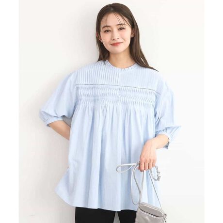 ピンタックをフロントに贅沢にあしらったブラウス。肘が隠れる袖丈に、胸元からふんわりと広がるシルエットが一枚で華やかさと、ストレスフリーな着心地の両方を叶えてくれます。