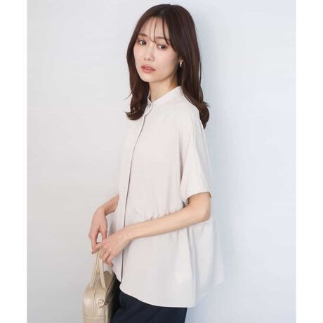 ウエスト部分はドローストリング仕様で、シルエットの調節ができ、腰周りもさりげなくカバーしてくれるバンドカラーブラウス。釦を開けて、軽い羽織りとしても着用できます。