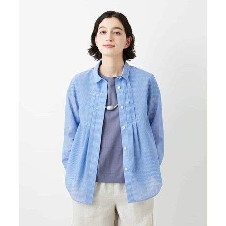 フェミニン感あるストライプブラウス。胸元の太めのピンタックに小ぶりの襟がきちんと感と甘さをプラス。お花のような柔らかなピンク、オレンジ、清涼感あるヘブンリーブルー(西洋朝顔色)と、それぞれ印象が違うカラーの展開。シンプルなパンツやスカートと合わせるだけで上品さある大人カジュアルスタイルが完成。気温が上昇してきたら前を開けて初夏の羽織りアイテムとしても活躍する一枚です。 同素材のプルオーバーブラウス【NHBGF85230】もございます。
