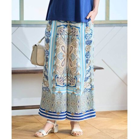 大胆なマリンブルーの利いたペイズリーパネルプリントが印象的なワイドパンツ。