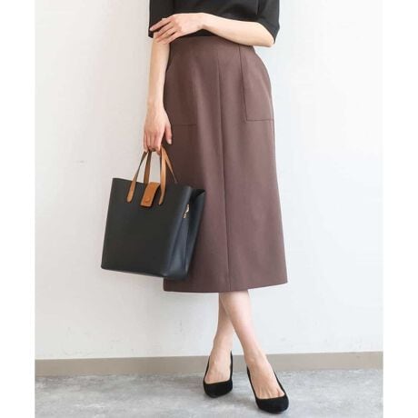 パッチポケットをポイントにしたシンプルなデザインのタイトスカート。フロントはベルトレスのすっきりとしたデザインで、後ろのベルトは切り替えてゴムを入れているので安定感のある着心地です。