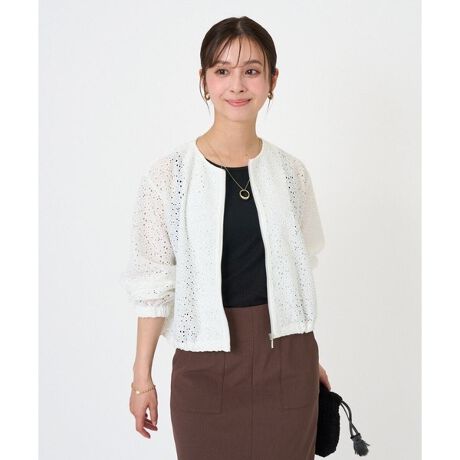 レース素材のジップアップブルゾンはシンプルなコーディネートのポイントにも着映えます。甘すぎないラッセルレースなので、コーディネートを選びにくいのも嬉しい。
