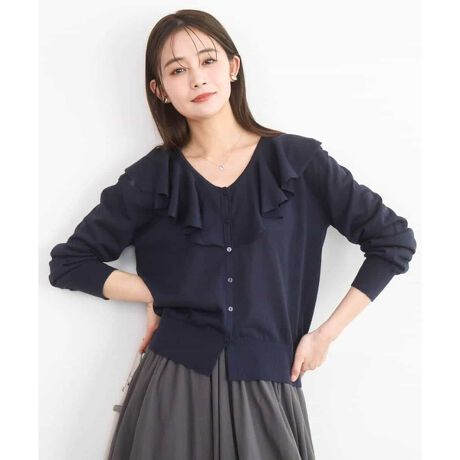 釦を閉じてプルオーバーとしてすっきりと着こなすのが素敵。ラッフルの動きが肩掛けしても華やかなアクセントになります。甘すぎない大人のラッフル衿カーディガンは買い足しアイテムとしてもおすすめです。