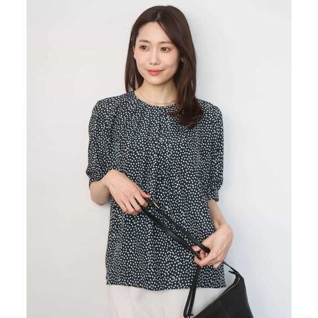細かな柄はきれいめな印象で、オフィスなどのきれいめシーンにも最適。スカートやパンツにそのまま合わせるだけでも上品な華やかさがあり、シンプルなコーディネートも寂しくなりません。