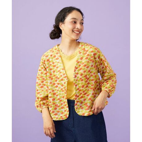 上品なシアー感のある花柄のパイルジャカードが軽やかなカーディガン。襟元がすっきり見えるV開きデザインです。ラウンドした裾のデザインで開けても閉じても綺麗なシルエットに。袖口にゴムを入れ、腕まくりしやすいのもうれしいポイント。ホコモモラらしいカラフルなフラワージャカード素材が春らしい華やかなひと品です。