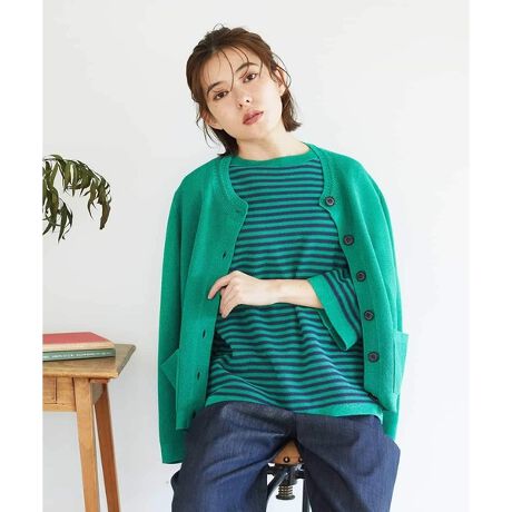 身頃は少しゆったりめで、体に自然にフィットしながらも動きやすいシルエットです。ガーター編みの表面はドライタッチで、暑い日でもさらっと快適に着られます。長く続く夏でも活躍するニットカーディガンです。ボタンは大小使いがさりげないアクセントになっています。