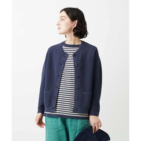 身頃は少しゆったりめで、体に自然にフィットしながらも動きやすいシルエットです。ガーター編みの表面はドライタッチで、暑い日でもさらっと快適に着られます。長く続く夏でも活躍するニットカーディガンです。ボタンは大小使いがさりげないアクセントになっています。