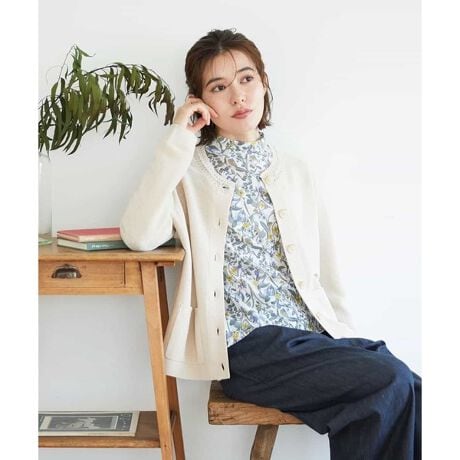 身頃は少しゆったりめで、体に自然にフィットしながらも動きやすいシルエットです。ガーター編みの表面はドライタッチで、暑い日でもさらっと快適に着られます。長く続く夏でも活躍するニットカーディガンです。ボタンは大小使いがさりげないアクセントになっています。