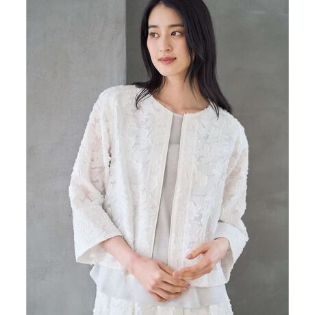 カットジャガードの上品な毛足感と軽やかなシアー感のある表情が特徴の羽織り。