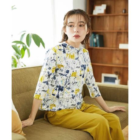 開きすぎず詰まりすぎていない程よい明きで気になる首元をさりげなくカバーしてくれるボトルネックのプルオーバーです。プリントは手描き風のアーティスティックなポップ柄、カジュアルスタイルを元気に見せてくれる一枚です。暖かな日には一枚着としてOK、また重ね着インナーとしてもおすすめです。