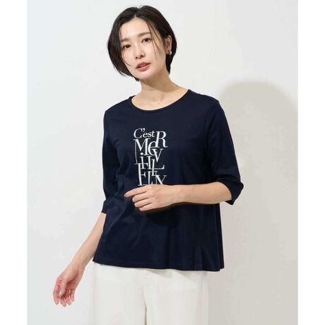 コンパクトながら裾にかけてAラインのゆとりあるシルエットで気になる部分をカバーし細見えを叶えてくれるカットソーです。袖丈は肘が隠れる絶妙な丈で、二の腕をすっきり見せてくれます。「Cest merveilleux/ 素晴らしい!」と言うフランス語のフレーズを箔より細かいアルミ粉をプリントで表現しています。箔より光り過ぎず、上品な光沢感できれい見えするプルオーバーです。柔らかく滑らかな質感なので着心地が良く、春夏のヘビロテアイテムになること間違いない一枚です。