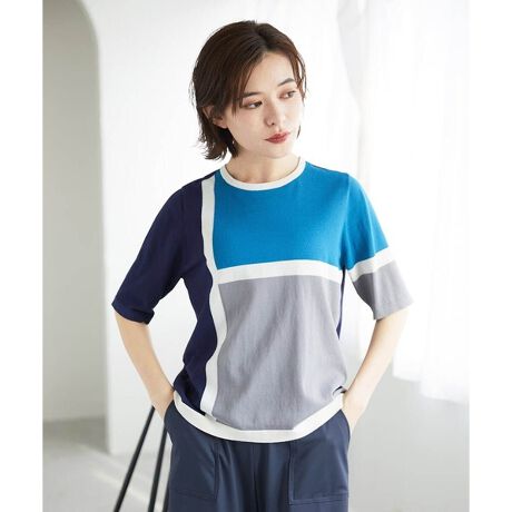 大胆なカラーブロック柄をインターシャで編上げたニットです。薄地で伸縮性があり、ナチュラルに体にフィットしてくれて、快適な着心地となっています。繊細な柄を鮮明に表現されており、コーディネートのアクセント使いにぴったりな一枚です。裏面がフラットな仕上がりなので、ごわつきがなく、とても着心地の良いニットです。腕まわりがすっきりと見える肘が隠れる袖丈もポイントです。