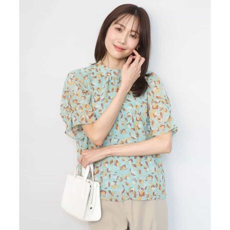 花びらが舞っているようなプリントが印象的なブラウス。胸元も安心な低めのスタンドネックに、タックスリーブでふんわりと二の腕をカバーしてくれるデザインが上品で大人可愛い印象で着こなせます。