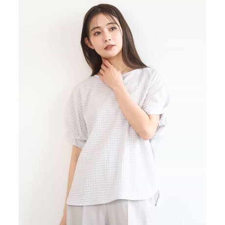 立体的なタックスリーブがデザインポイントのブラウス。一枚でさっと着るだけでスタイリングが決まります。顔周りがすっきりと見えるクルーネックもポイント。