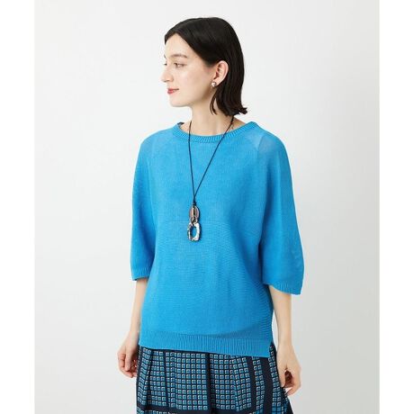 肌離れの良いペーパーナイロン素材をホールガーメント編みした5分袖ニットです。ガーターとカノコ柄を切り替え襟元には寄せ目ラインで編み変化をつけています。伸縮性があり、ほどよい透け感が特徴の素材でお作りしたニットになります。適度なゆとりを持たせたサイズ感で、装いにこなれ感を添えてくれる一枚です。編み目がないのでニット特有のごわつきやチクチク感が気にならず、とても着心地の良いニットとなっています。