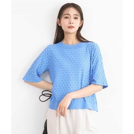 ブロック調の凹凸柄に細ボーダーラインが上品な一枚で着映えるニットトップス。太めのリブ衿と後ろ釦のディティールでお顔周りもすっきりと決まるデザインです。