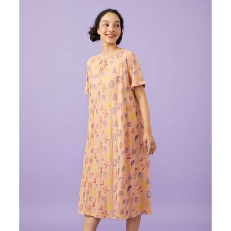 ポップな色と柄の組み合わせがかわいいワンピース。ストレスフリーなゆとりあるシルエットです。セットインスリーブですっきりとした着心地を実現。首元にはギャザーを寄せ、女性らしい雰囲気を後押しします。後ろの涙開きにも注目。カラフルな柄が主役のワンピースは日常使いにぴったりな着心地の良いワンピースです。