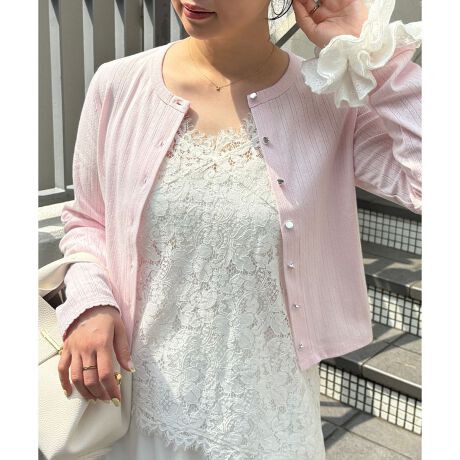 パターンメッシュの表面感で、シンプルながらもさりげないアクセントのカーディガン。身体に程よくフィットするシルエットで女性らしいラインを演出します。メタルボタンがコーデを引き締め、きれいめにも合わせやすいデザインです。ボタンを閉じてトップス風にも、開けて軽い羽織りとしても活躍。