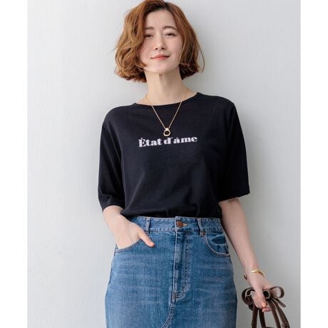フロントに「etat d'ame(エタダーム)」のロゴをあしらった5分袖ニットプルオーバーです。「落ち着いた心」を意味するフランス語をインターシャ編みで表現し、プリントTシャツとは一味違う高級感のある仕上がりになっています。程よい透け感のある素材を使用することで、カジュアルになりすぎず女性らしい上品な印象を演出します。コンパクトな見た目ながらも体のラインを拾いすぎない絶妙なサイズ感にこだわりました。一枚で着るのはもちろん、ジャケットやカーディガンのインナーとしてロゴを覗かせるスタイリングもおすすめです。デニムと合わせた大人のカジュアルスタイルから、フレアスカートと合わせたフェミニンな装いまで幅広く活躍します。カラーは、清涼感のあるホワイト(#001)、落ち着いたトーンのブラウン(#030)、爽やかなアクセントになるスカイブルー(#072)、シックで合わせやすいネイビー(#075)の4色展開です。