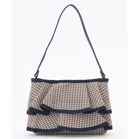 ■デザイン・素材・チュール素材を贅沢に重ねたラッフルデザインが、いつものファッションに夏らしさをプラスします。・コンパクトながらペットボトルも入れられる内容量があり、小物を入れられるポケットが内外1個ずつあります。・ちょっとしたお出かけにぴったりのハンドバッグです。・華やかで涼しげなデザインがコーディネートのアクセントに最適です。