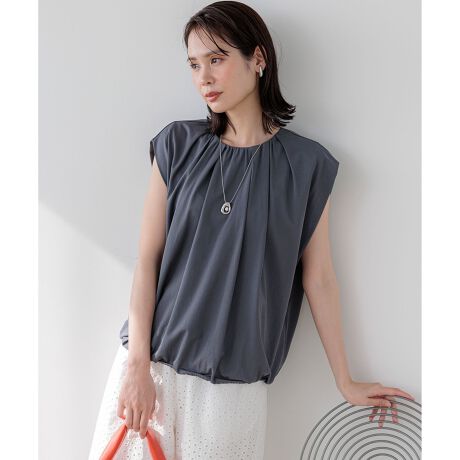 ■デザイン・襟元からのギャザーが体を包みこむように腕のラインをカバーしてくれるドロップショルダーカットソー。・バルーンのようなシルエットがブラウスライクな印象をくれる1枚です。・裾のゴムでブラウジングして短めに着用も可能です。・コンシールファスナー開きなので着脱が楽に設計されています。