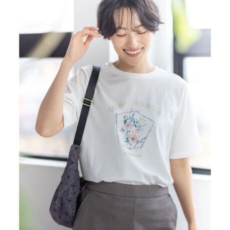 [型番:491269]ひんやり心地よいひやさらTUVカットと接触冷感機能を備えた、暑い季節に嬉しい半袖Tシャツ。胸元の花柄プリントと箔押しの英字がさりげないアクセントになり、シンプルながらも華やかさをプラスします。シャツやカーディガンのインナーとして取り入れて、プリントをのぞかせる着こなしもおすすめです。