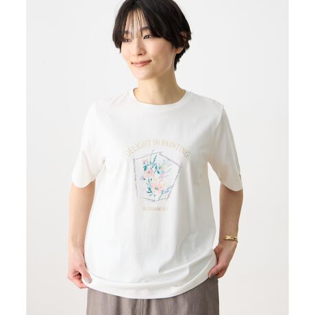 [型番:491269]ひんやり心地よいひやさらTUVカットと接触冷感機能を備えた、暑い季節に嬉しい半袖Tシャツ。胸元の花柄プリントと箔押しの英字がさりげないアクセントになり、シンプルながらも華やかさをプラスします。シャツやカーディガンのインナーとして取り入れて、プリントをのぞかせる着こなしもおすすめです。