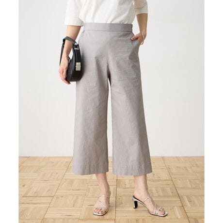 [型番:494666]人気のワイドパンツで、上品に大人っぽく。毎年人気のワイドパンツ。緩やかに広がるシルエットが足のラインを美しく魅せ、股下は長めに設定し、上品で大人っぽい印象に仕上げました。ウエスト後部をゴム仕様にすることで締めつけ感もなく、前部分はフラットですっきりとした見た目をキープ。普段のオフィススタイルから休日の街着コーデまで幅広く活躍します。