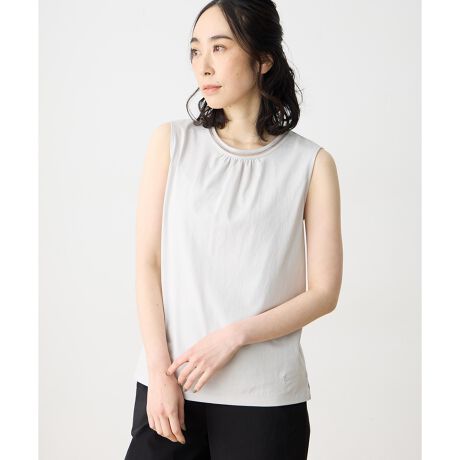 [型番:491260]夏の着こなしをひんやり涼しく、上品に。夏のお出かけに嬉しい、UVカット&接触冷感機能付きのタンクトップ。衿ぐりのダブルピコが顔周りを華やかに引き立てます。両サイドにはスリットを設けリラックス感のある着こなしに仕上げました。左裾の刺しゅうがさりげないアクセントを添え、一枚着はもちろん、ジャケットのインナーとしても活躍します。