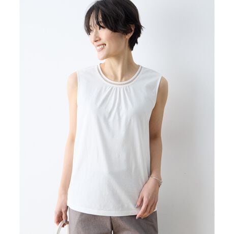[型番:491260]夏の着こなしをひんやり涼しく、上品に。夏のお出かけに嬉しい、UVカット&接触冷感機能付きのタンクトップ。衿ぐりのダブルピコが顔周りを華やかに引き立てます。両サイドにはスリットを設けリラックス感のある着こなしに仕上げました。左裾の刺しゅうがさりげないアクセントを添え、一枚着はもちろん、ジャケットのインナーとしても活躍します。
